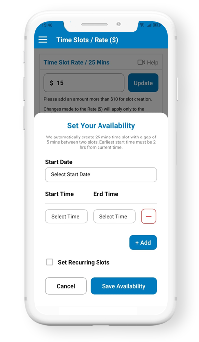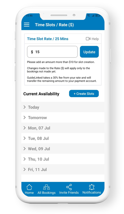 GUIDES: You are expected to link your bank account with our safe and secure STRIPE payment gateway. Once this is done, you can create an easy to use calendar for users to view slots and book them for calls with you. Set your Video call rates and view/modify your availibility too anytime!
